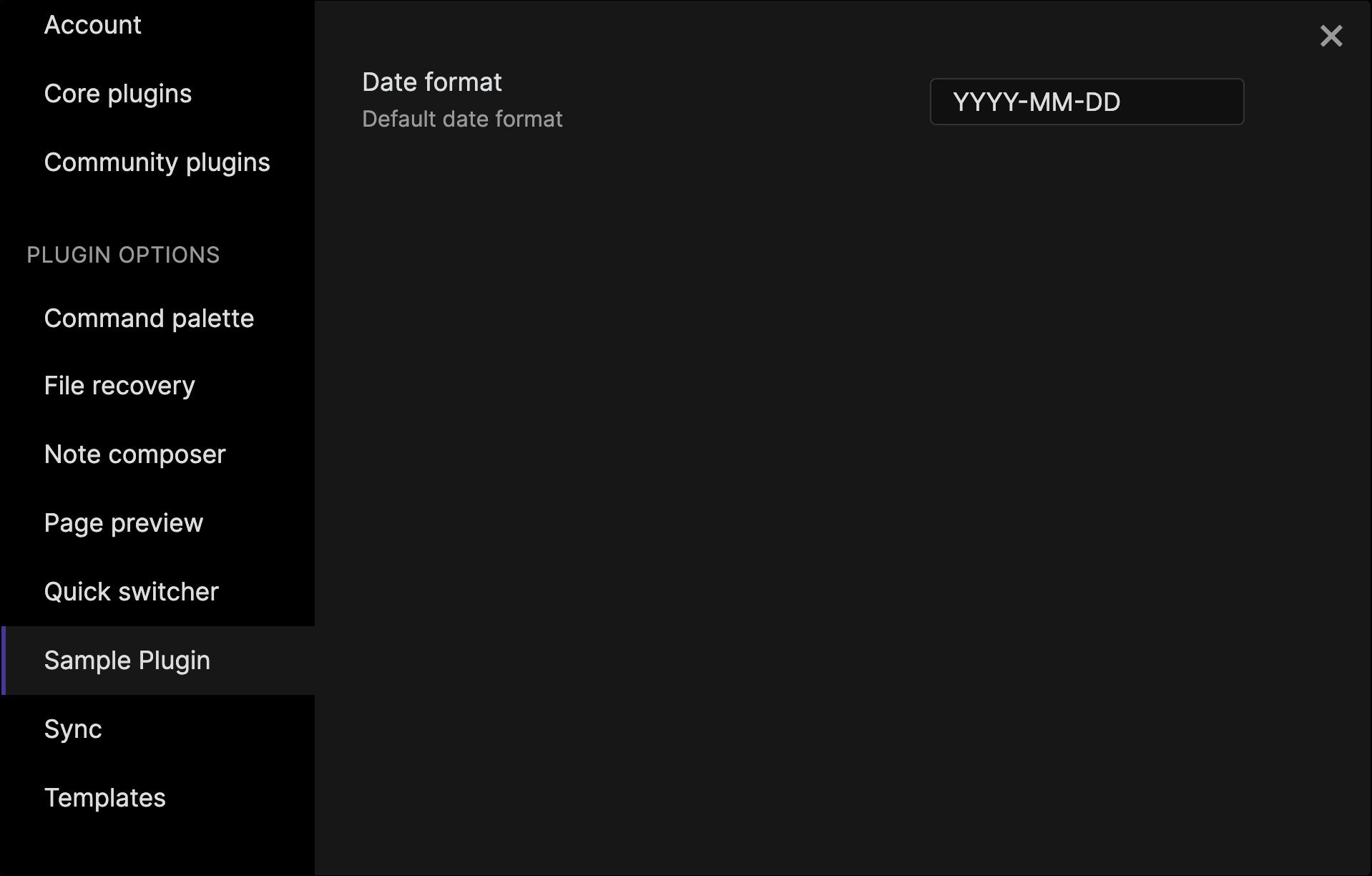 ๋จผ์ , ์ฌ์ฉ์๊ฐ ๊ตฌ์ฑํ ์ ์๋๋ก ํ๋ ค๋ ์ค์ ์ ๋ํ ์ ์ ExamplePluginSettings๋ฅผ ๋ง๋ค์ด์ผ ํฉ๋๋ค. ํ๋ฌ๊ทธ์ธ์ด ํ์ฑํ๋์ด ์๋ ๋์ settings ๋ฉค๋ฒ ๋ณ์์์ ์ค์ ์ ์ ๊ทผํ ์ ์์ต๋๋ค.